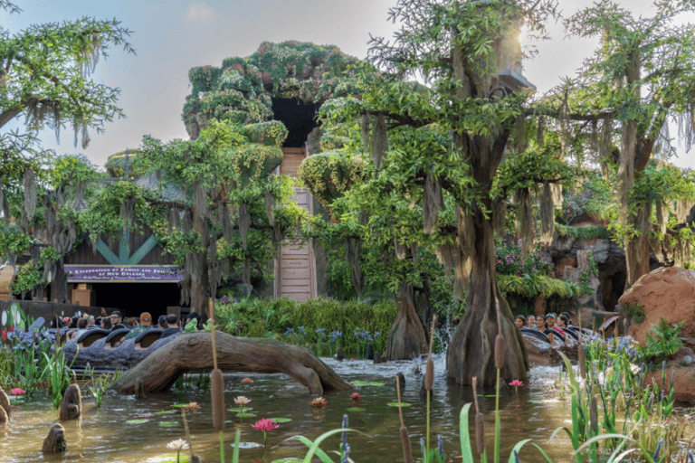 It's pouring rain, and you're already soaked from head to toe. So why not hop on a water ride? The log flume attraction invites guests into Princess Tiana's vibrant New Orleans world, complete with joyful music, lush bayou scenes, and a heartwarming storyline about community and celebration. As you float along the outdoor sections in light rain, the drops blend seamlessly with the mist, and the scent of wet wood and greenery fills the air. It feels authentic-like a Louisiana rainstorm just rolled through the bayou.